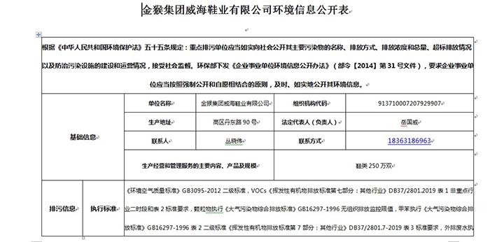 金猴集團威海鞋業(yè)有限公司環(huán)境信息公開表