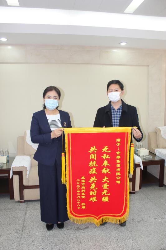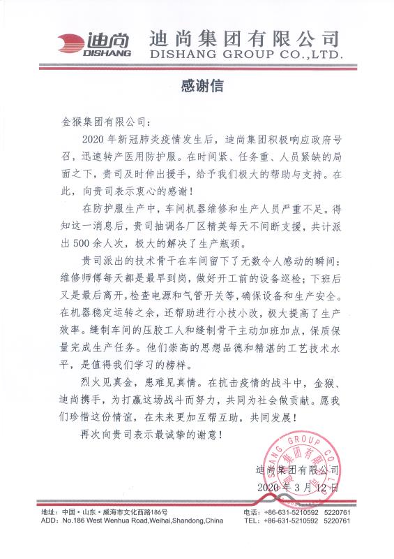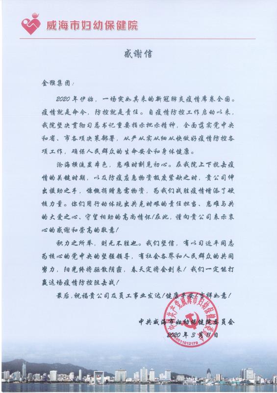 近兩月來,威海市委市政府及5區(qū)2市主要領(lǐng)導(dǎo)先后給集團(tuán)董事長打電話稱贊金猴集團(tuán)在抗擊新冠病毒戰(zhàn)役中的慈心善舉,婦幼保健院赴武漢醫(yī)療隊(duì)、威海胸科醫(yī)院、環(huán)翠樓街道商圈黨委、迪尚集團(tuán)等單位還給我公司送來感謝信和錦旗,對(duì)我公司積極出錢出人出物資全力支持部隊(duì)、地方政府、衛(wèi)生系統(tǒng)打贏疫情阻擊戰(zhàn)表示欽佩和感激。