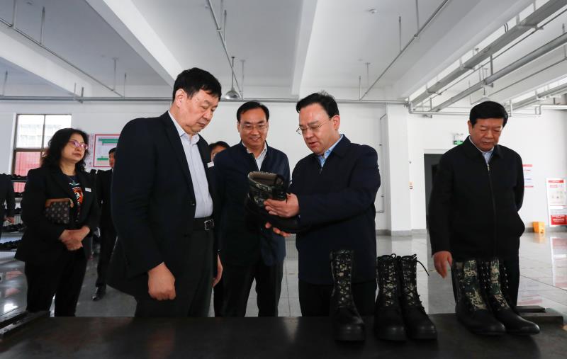 市委副書記、代市長(zhǎng)閆劍波(右二)在集團(tuán)黨委書記、董事長(zhǎng)柳富林(右四)的陪同下視察鞋業(yè)生產(chǎn)車間