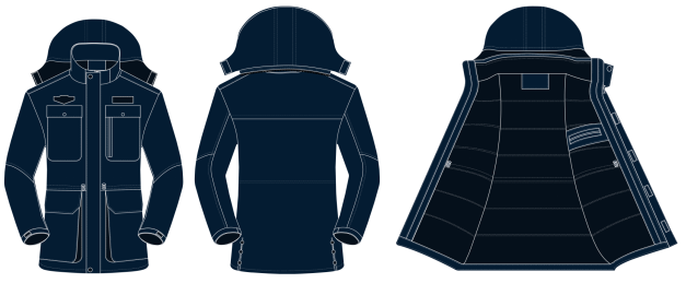 3、上衣內(nèi)膽為可拆卸式抓絨內(nèi)膽;左掛面有單開線豎里袋,中腰部分有可調(diào)節(jié)松緊的抽繩,固定抽繩的貼布扎透面層。