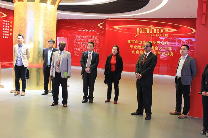 伯哈內(nèi)大使一行認(rèn)真參觀了生產(chǎn)車間制鞋流水線,詳細(xì)了解了內(nèi)銷、出口及軍用皮鞋研發(fā)生產(chǎn)情況,高度贊揚(yáng)金猴皮鞋成功包攬中國馳名商標(biāo)、中國名牌產(chǎn)品、中國真皮領(lǐng)先鞋王、中國500最具價值品牌等所有行業(yè)頂級殊榮,暢銷全國并出口40多個國家和地區(qū),曾多次被全國部分省(市)人大、政協(xié)、工會、團(tuán)委、公安、檢察院、法院、司法、工商、質(zhì)檢、海關(guān)等單位選定為工作用鞋。在膠東(威海)黨性教育基地金猴展陳館,伯哈內(nèi)大使認(rèn)真參觀了企業(yè)文史館和私人定制館,對公司做好黨性教育基地與工業(yè)旅游示范點相結(jié)合的大文章頻頻點贊。