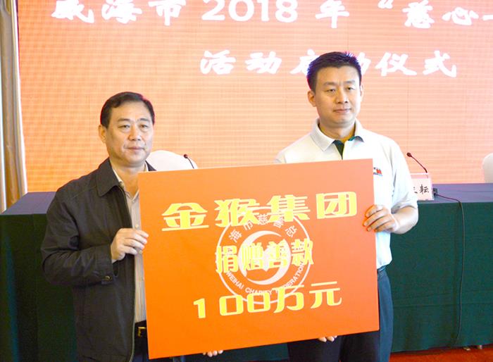 9月19日,威海市2018年“慈心一日捐”活動啟動儀式在東山賓館舉行。集團公司董事、副總經(jīng)理岳國威代表全市愛心企業(yè)和個人宣讀了《2018年“慈心一日捐”活動倡議書》,并代表金猴集團向市慈善總會捐款100萬元。